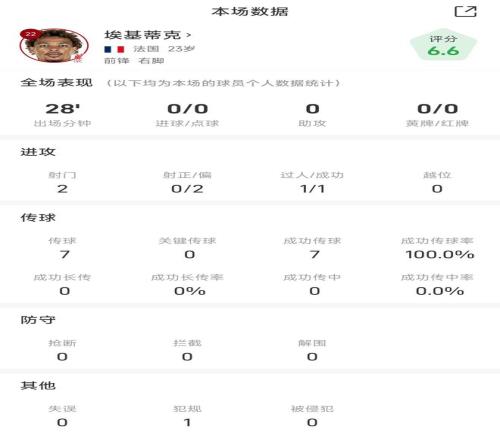 雷速体育10月20日宣 在今天凌晨结束的英超双红会中,利物浦前锋埃基蒂克替补出场28分钟未能救主。
