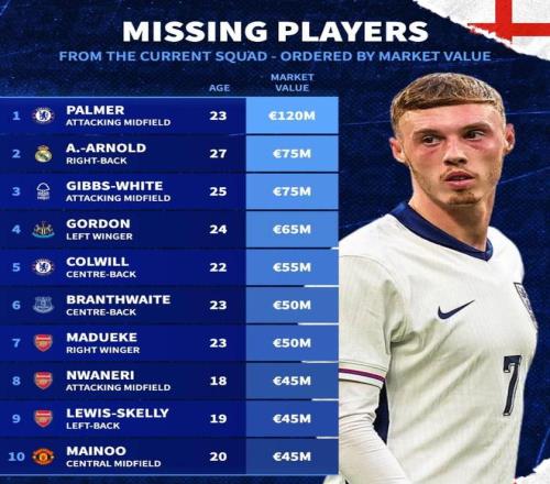 北京时间11月17日,在英格兰以7战全胜,打进22球0丢球的成绩挺进2026年美加墨世界杯之后,德转列出了此次未入选英格兰代表身价排名前10的球员,身价达到1.2亿欧元的帕尔默排名第一,亚历山大-阿诺德和吉布斯-怀特7500万欧元并列第二。