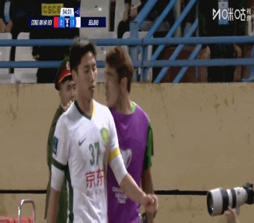 易边再战,第50分钟国安后防注意力不集中,河内公安前场界外球快发,阮庭北突入禁区后传中造险,江文豪抢先一步解围的同时被对手铲倒。