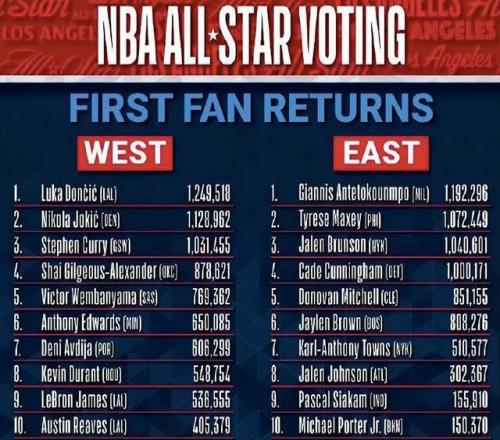 2026年NBA全明星球迷投票首轮结果出炉,东契奇领跑全联盟(票王),字母哥东部第一。而作为联盟老牌球星的代表,库里拿到100多万票,排在西部第三;杜兰特则以差不多55万票排在西部第八,詹姆斯则以差不多54万票仅排在西部第九。东道主的哈登则只有21.5万票排在西部第12位,莱昂纳德只排在第20。